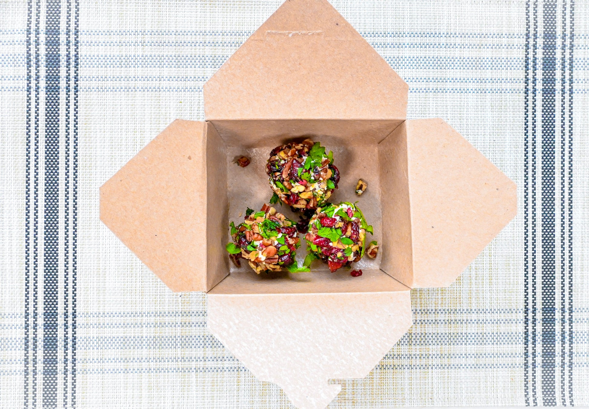 5 Truffles made with goat cheese, honey, orange, basil and sea salt.. Rolled in crushed maple glazed pecans, dried cranberries and parsley