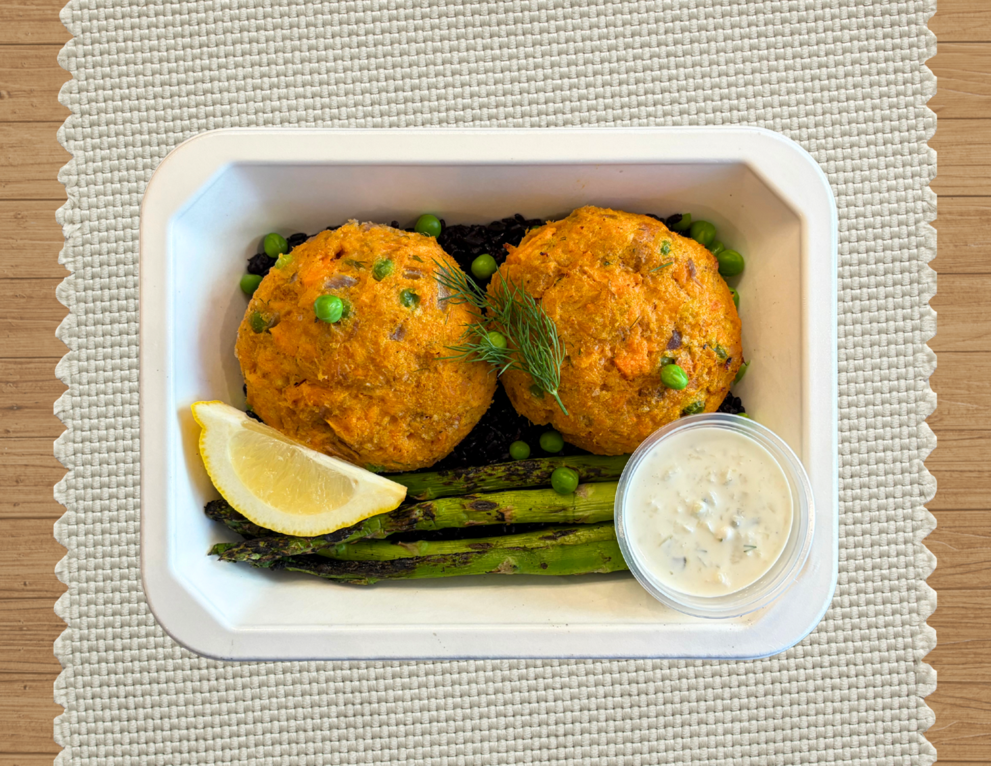Sweet and savory sweet potato salmon cakes with english peas, dill, lemon, and a hint of chipotle served with vegan tartar sauce, asparagus, and black rice