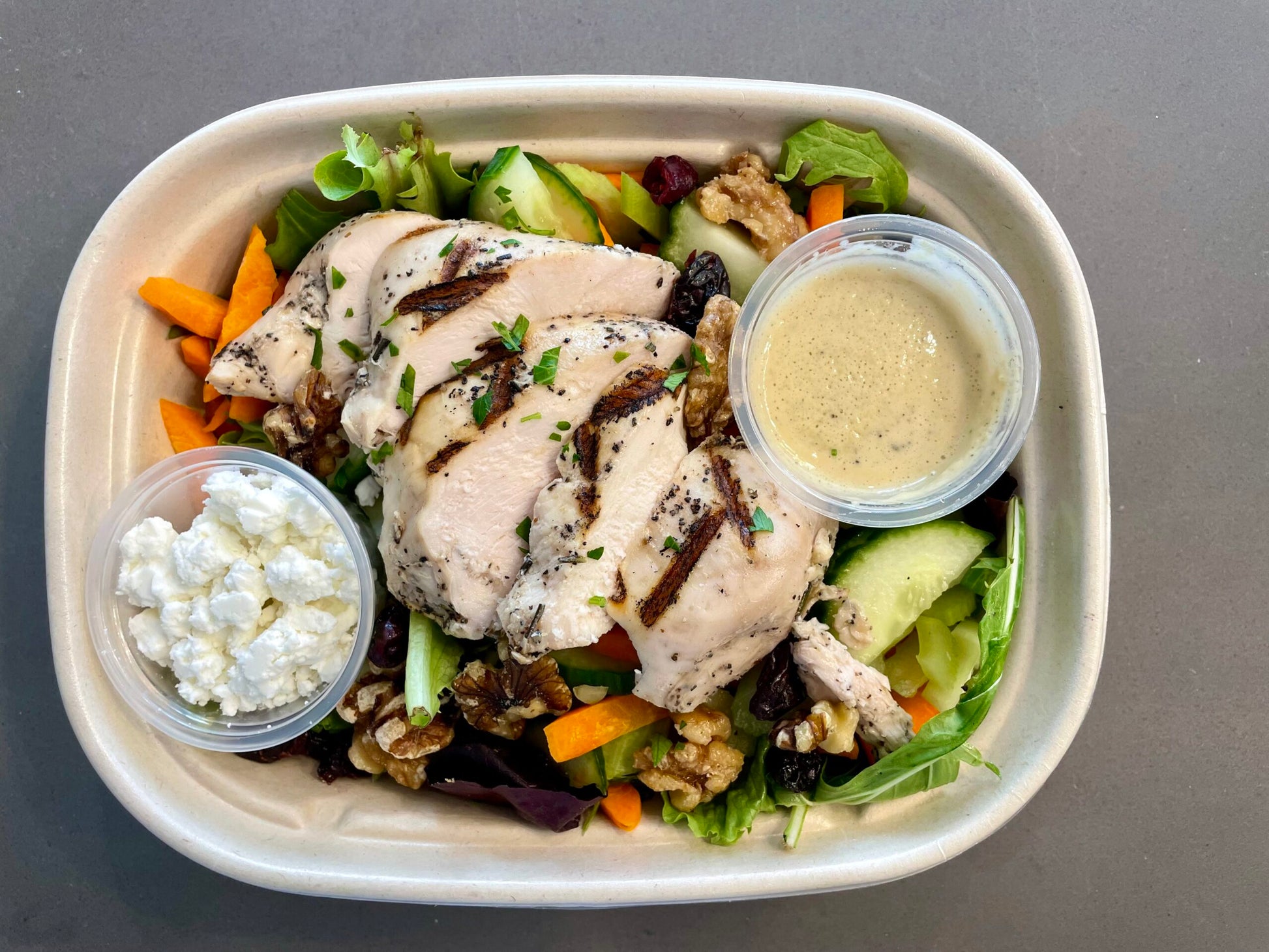 Mixed baby greens, celery, carrots, cucumbers, maple walnuts, dried cranberries, goat cheese, apple cider vinaigrette, and grilled chicken breast