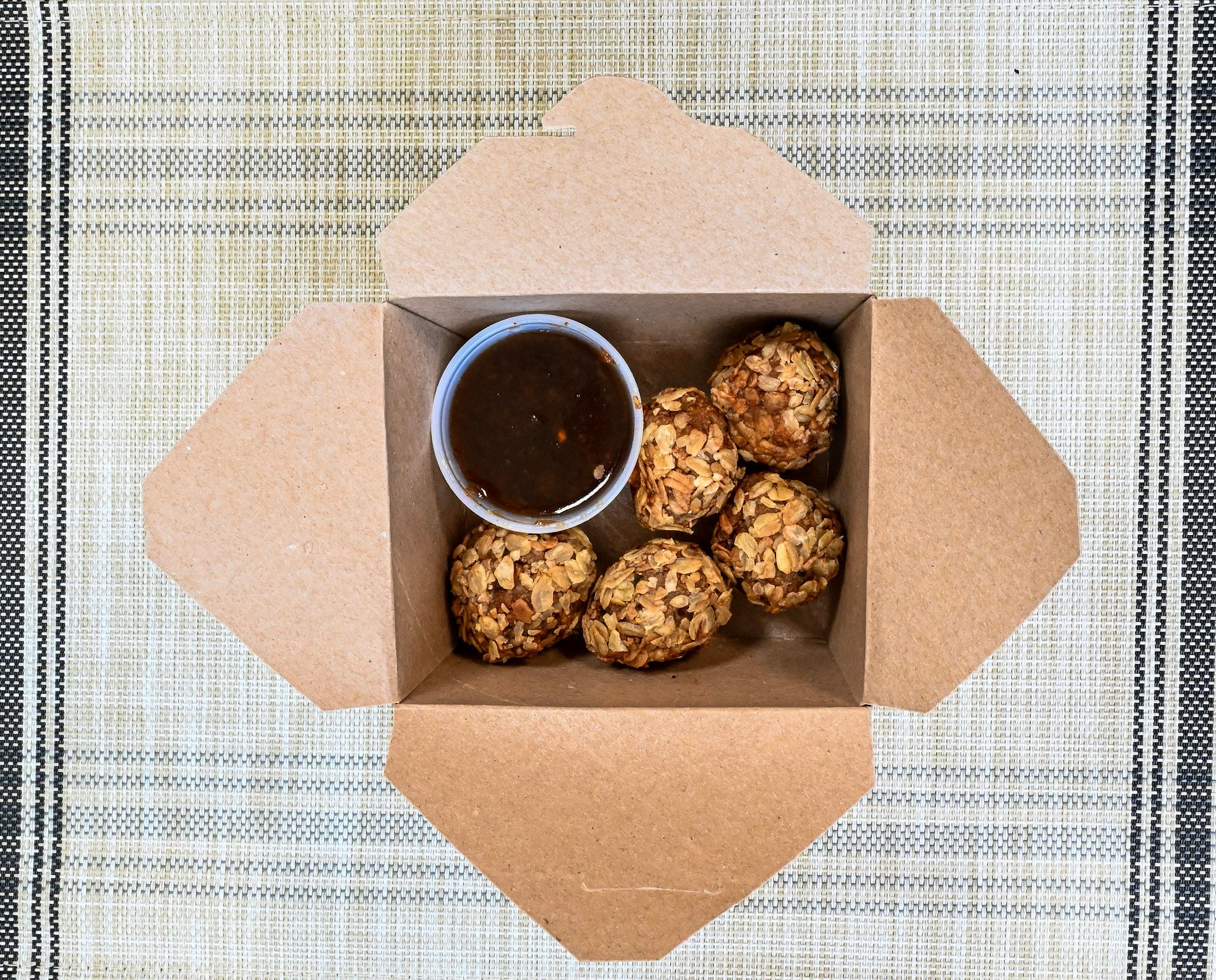 5 Grass-fed ground beef and free range turkey meatballs coated in granola and served with ginger teriyaki