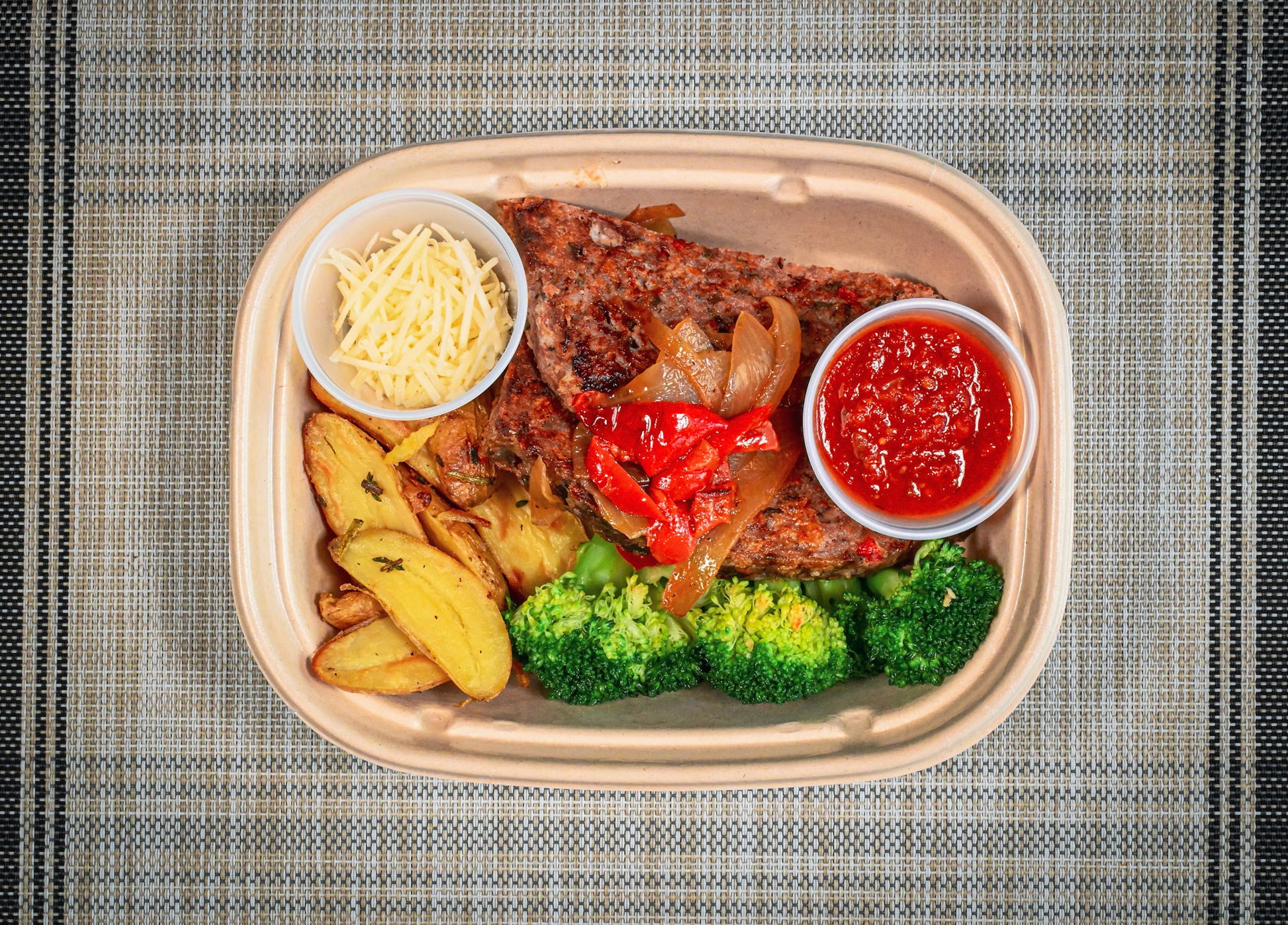 Ground turkey breast and grass-fed beef Italian meatloaf topped with caramelized onions and peppers, served with rosemary roasted fingerling potatoes, and garlicky broccoli with slow-cooked marinara and pecorino romano/parmesan