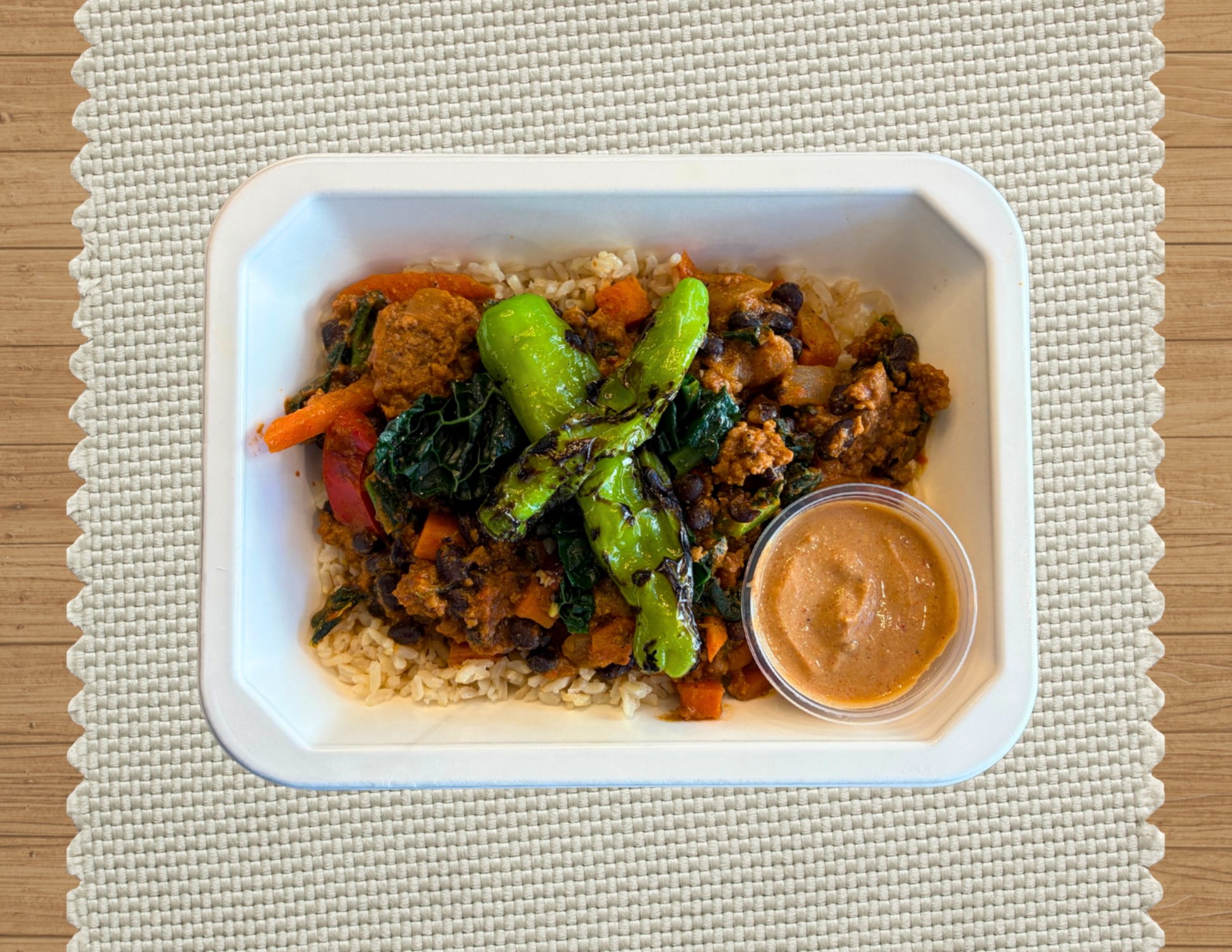 Grass-fed ground beef sautéed with onions, carrots, peppers, greens, and black beans, in red pepper coulis over brown rice and topped with roasted shishito pepper with chipotle tofu cream.
