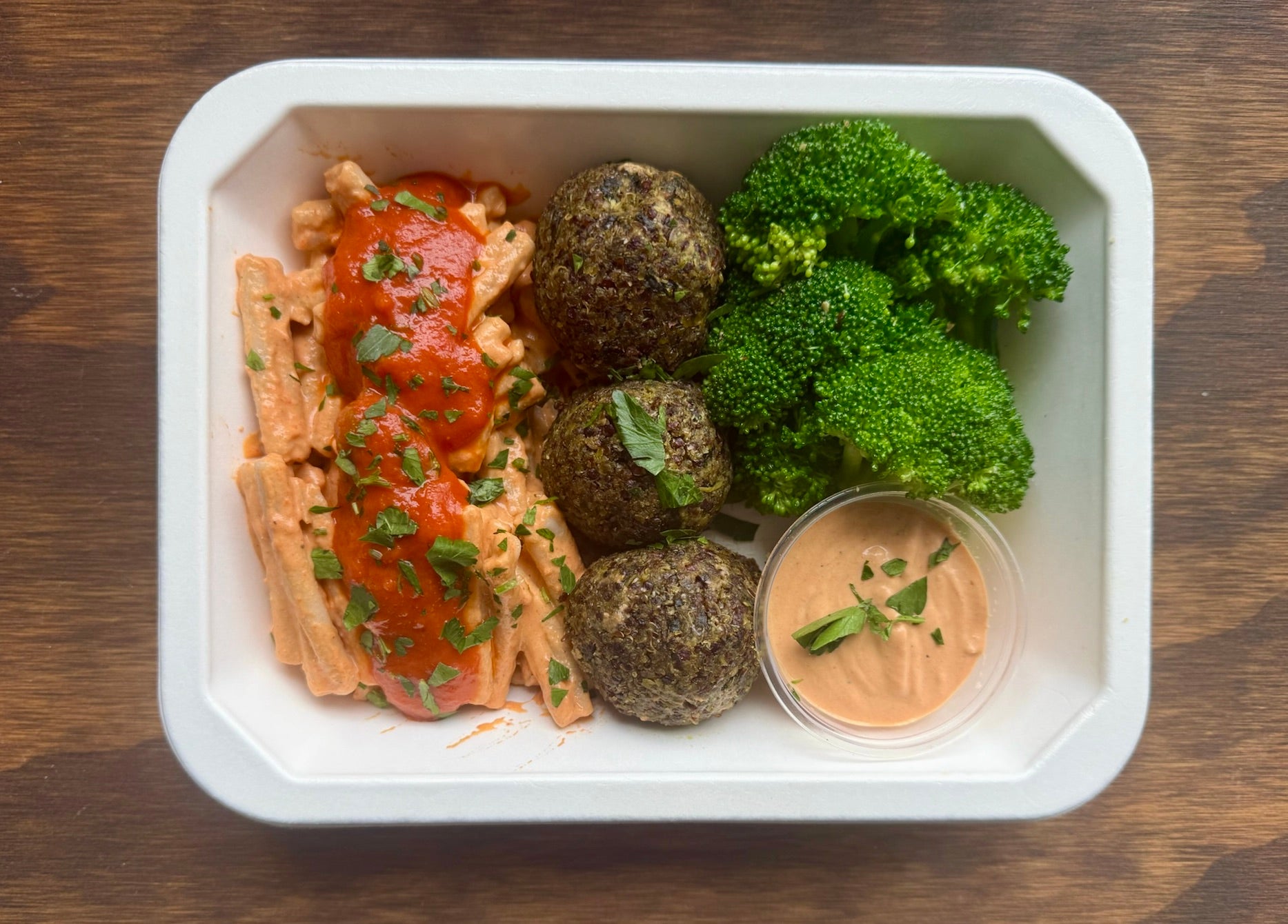 Roasted Red Pepper Cashew Cream over Brown Rice Pasta and Topped with Pesto Quinoa Bites and Roasted Broccoli.