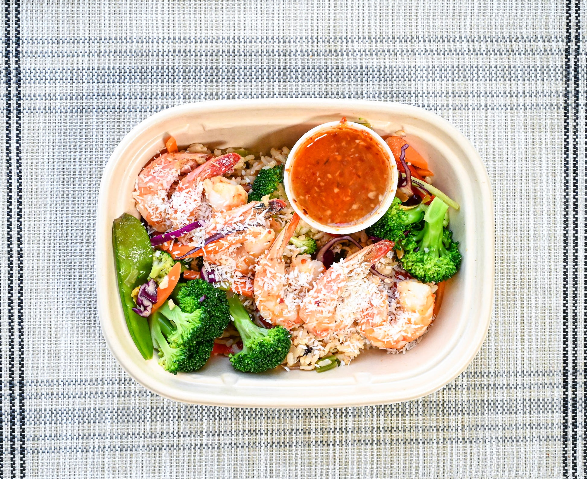 Wild caught coconut-lime shrimp with vegetable fried brown rice (clean plate style), and served with thai sweet chili sauce and toasted coconut