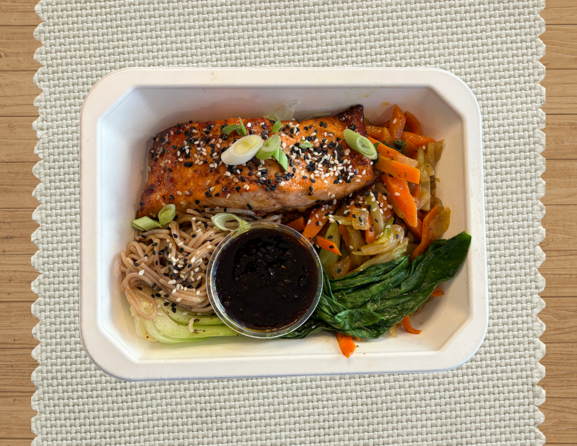 Ginger teriyaki sustainable salmon over gluten free soba noodles with peas, carrots, and red peppers; served with baby bok choy